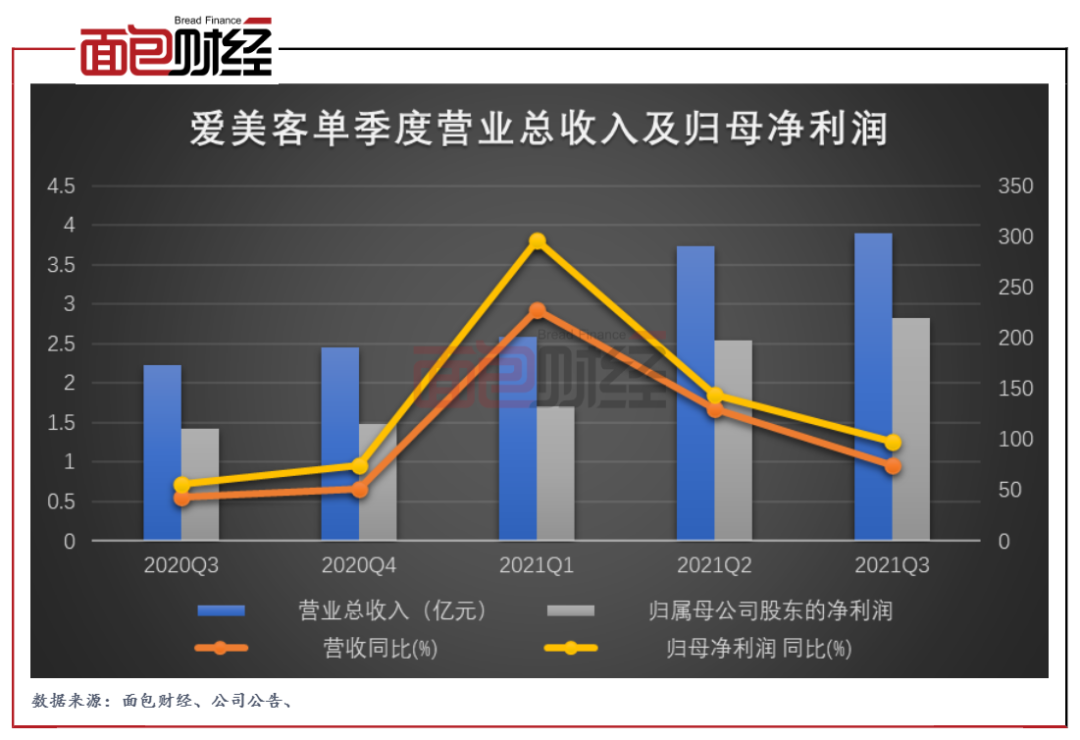 三季报显示,公司第三季度实现营收3.90亿元,归母净利润2.83亿元。值得注意的是,分季度来看,爱美客的营收增速及归母净利润增速均呈下降趋势。2021年第三季度,公司的营收增速为75.09%,相对比第二季度下降54.83个百分点。公司的归母净利润增速为98.01%,相比上季度下降46.37个百分点。公司的长期增长持续性值得关注。
