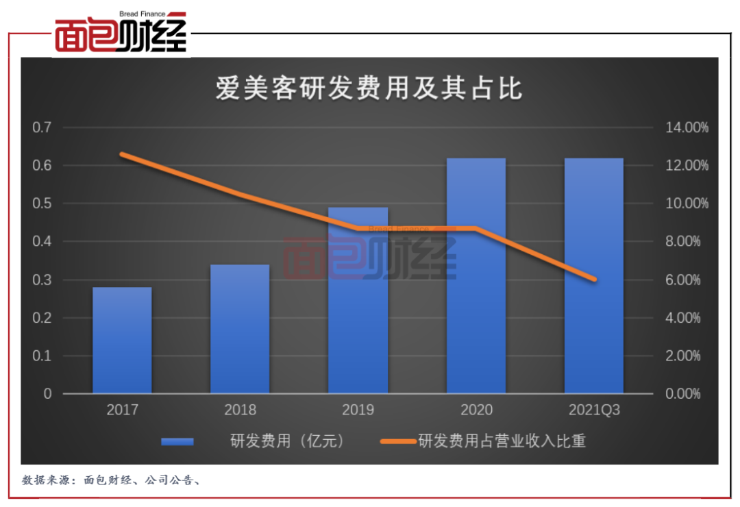 此外,近几年,爱美客的研发费用占营业收入比重呈下降趋势。2019年,公司研发费用占比为8.71%,同比减少1.78个百分点。2020年,爱美客研发费用为6180.4万元,占比与去年持平。2021年前三季度,公司的研发费用占比较上年末下降了2.68个百分点。