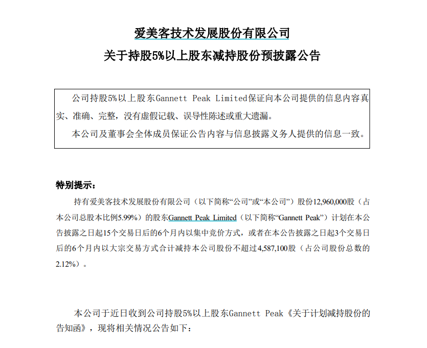 10月8日,爱美客发布持股5%以上股东拟减持公告,公告显示,持有爱美客1296万股(占公司总股本比例为5.99%)的股东Gannett Peak Limited计划在公告披露之日起15个交易日后的6个月内以集中竞价方式,或者在公告披露之日起3个交易日后的6个月内以大宗交易方式合计减持公司股份不超过约458.7万股(占公司股份总数的2.12%)。若按照当日股价计算,这部分总额超过27亿人民币。