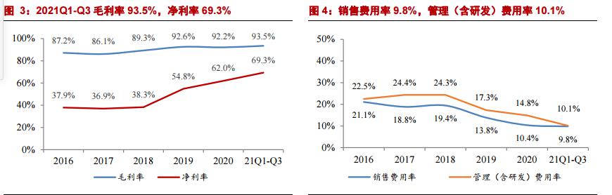 今年 10 月 14 日公司发布 2021 年三季报:公司前三季度实现营收 10.2 亿元,归母净利润 7.1 亿元,扣非归母净利润 6.7 亿元,分别同比增长 120.3%、144.1%、139.1%;其中三季度实现营收 3.9 亿元,归母净利润 2.8 亿元,扣非归母净利润 2.6 亿元,同比分别增长 75.1%、98.0%、86.0%。