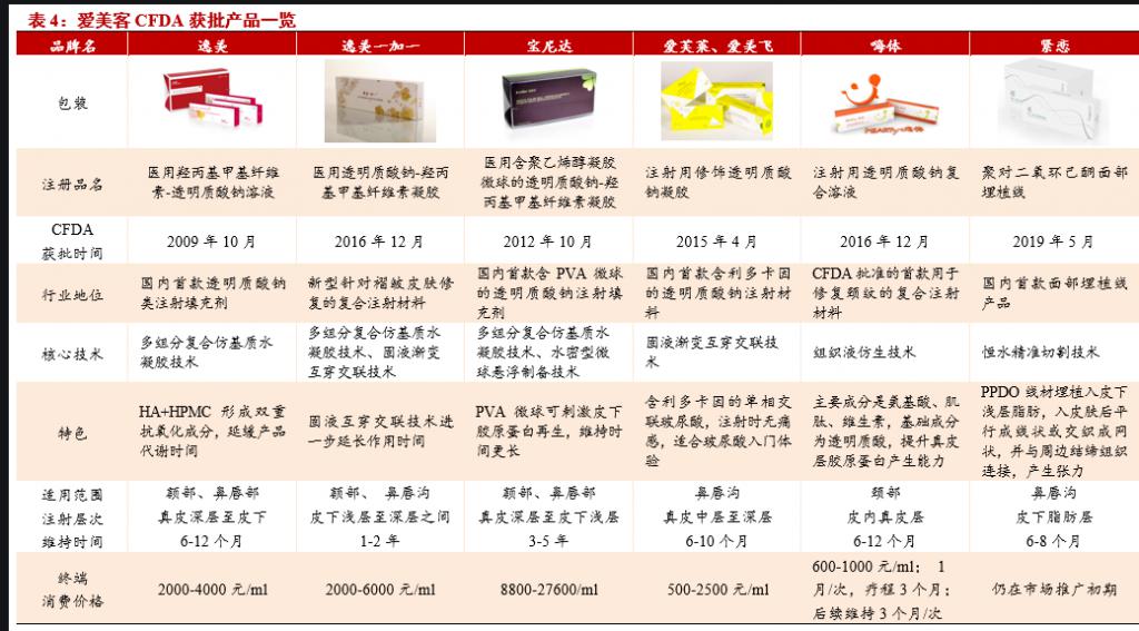 5 张证书对应上市产品分别为爱美飞/爱芙莱、宝尼达、逸美一加一、嗨体、逸美,值得一提的是注射类产品为了术后效果保持良好基本都得在 3-6 个月后继续加针,这就赋予了爱美客成瘾性,据目前统计注射类产品复购率接近 100%。