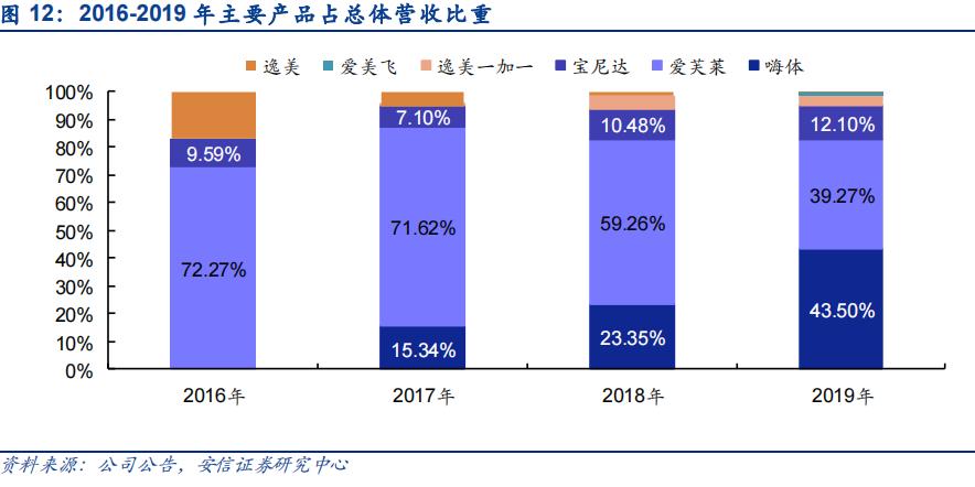 在此期间,营收增长最迅猛是嗨体。2016年12月刚拿证,2017年1月就上市,并为公司立下汗马功劳。其营收贡献从2017年占总营收的15.34%(3400万)直接上升到2019年占总营收的43.5%(2.42亿)。