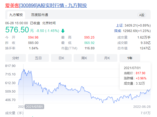2021年2月,爱美客的股价一度飙升至1330元/股,一举成为A股市场上第三只价格上千元的个股。但随着市场行情的转变和资本市场的降温,截至今天(6月28日)收盘,爱美客576.5元/股的价格仅对比近一年的高点,就已回撤了约30%。