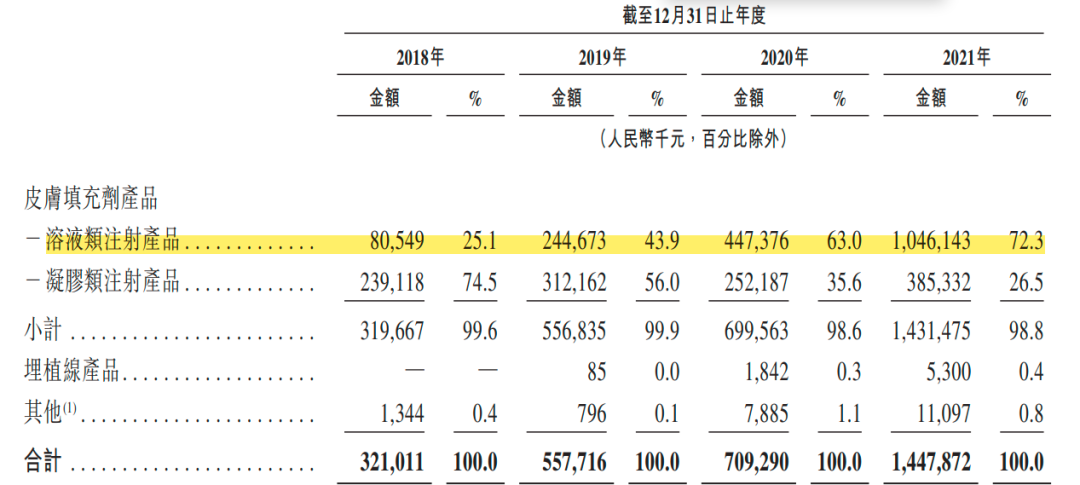 爱美客的皮肤填充剂产品主要分为溶液类注射产品和凝胶类注射产品,其中,溶液类注射产品是其重要收入来源,收入占比由2018年的25.1%一路攀升至2021年的72.3%。