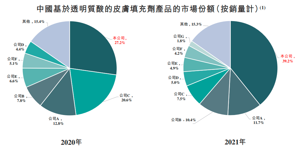 据弗若斯特沙利文报告显示,以2021年的销量计算,爱美客的市场份额约为39.2%,比2020年增加了12个百分点;以销售额计算,其市场份额约为21.3%,分别位列我国第一和第二基于透明质酸即玻尿酸皮肤填充剂供应商。