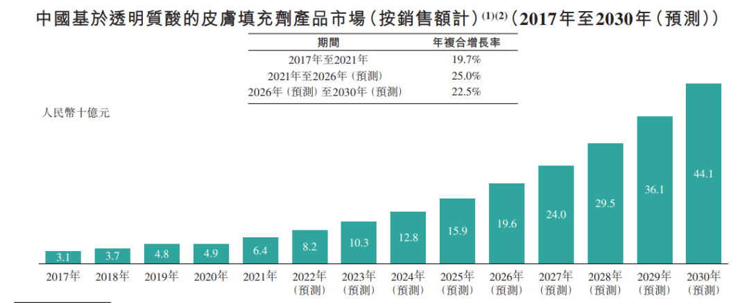 弗若斯特沙利文的报告数据显示,我国基于透明质酸的皮肤填充剂产品市场规模2017—2021年的年复合增长率为19.7%,预计未来10年的年复合增长率为22.5%—25%,2023年预计市场规模将达到441亿元。