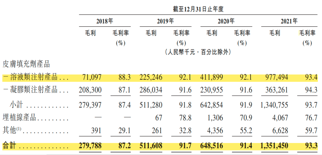 招股书显示,2018—2019年,爱美客的毛利率分别高达87.2%、 91.7%、91.4%和93.3%。