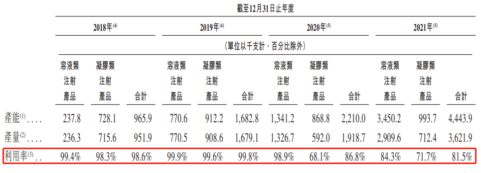 招股书显示,爱美客的产品产能利用率合计已从2019年的接近100%,持续下滑至2021年的81.5%。