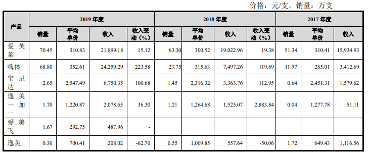 2019年度,爱美客主要产品爱芙莱、嗨体、宝尼达、逸美一加一、爱美飞和逸美单位成本分别为30.41元/支、24.72元/支、32.34元/支、44.33元/支、25.22元/支和27.53元/支。