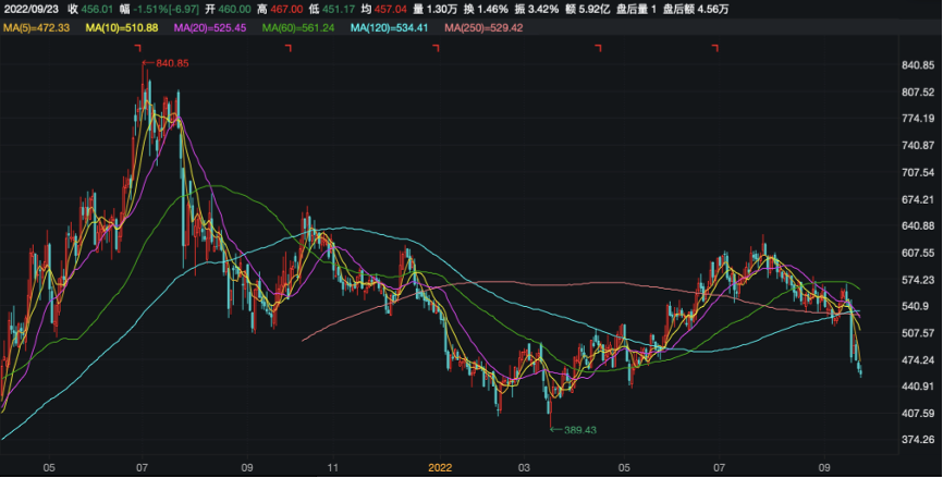 2022年2月,港交所披露信息显示,爱美客赴港上市申请材料“失效”,虽不意味着折戟,但对上市进程不免产生影响。随着上市文件失效,该公司股价也跟着一路回调,2022年3月,爱美客股价区间低点为389.43元/股,出现腰斩情况。截至9月22日收盘,该股报收于456.01元/股,总市值为987亿元,相较于2021年中时的历史高点,已累计下挫46%。