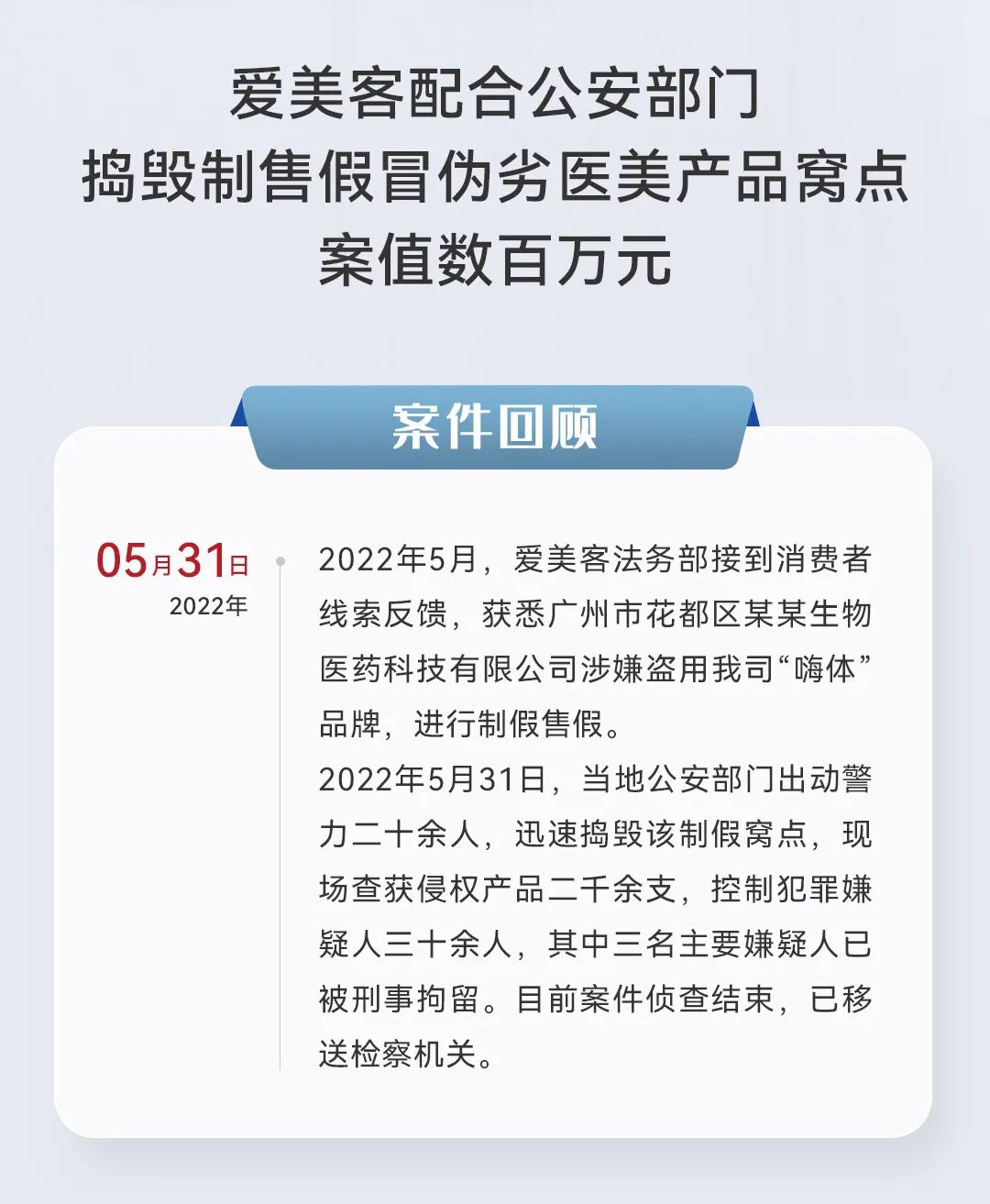 爱美客配合公安部门捣毁制售假冒伪劣医美产品窝点,案值数百万元