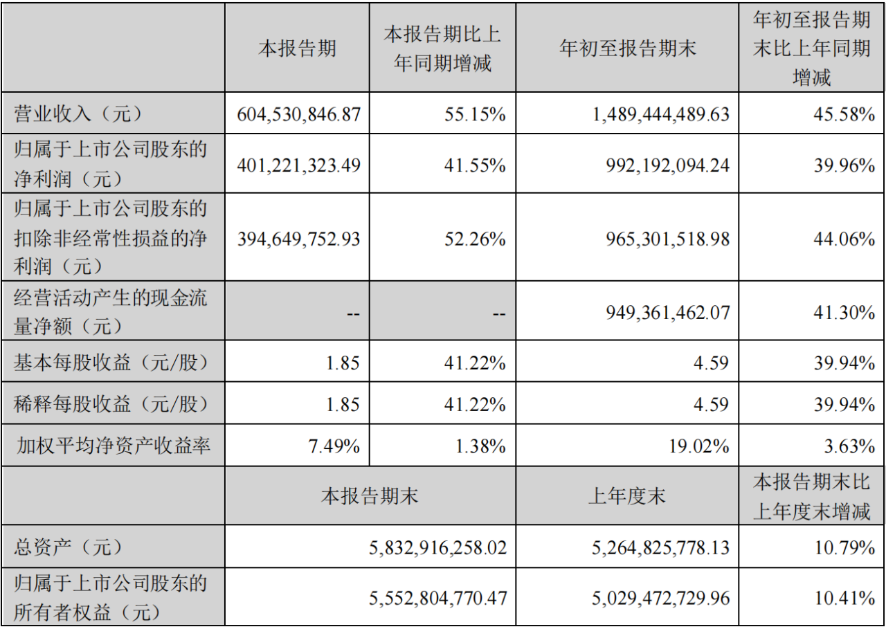 10月26日,爱美客发布了2022年前三季度的业绩报告,报告期内实现营业收入14.9亿元,同比增长了45.58%;同期归属于上市公司股东的扣非前和扣非后净利润分别为9.92亿元和9.65亿元,同比分别增长了39.96%和44.06%;同期经营活动产生的现金流量净额为9.49亿元,同比增长了41.3%。