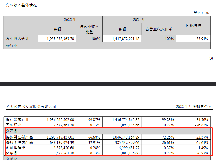2022年,情况再有加深。四项业务占营收比为66.68%、32.91%、0.28%和0.13%,即溶液类注射产品和凝胶类注射产品,已高达99.59%。面部埋植线营收仅537.84万元,同比微增1.49%;化妆品更从1109.71万元降至257.26万元,同比下降76.82%。