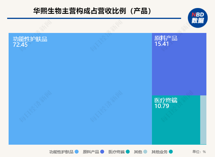 以华熙生物为例,自2020年起,功能性护肤品取代了原料产品,成为华熙生物营收的主要来源。2022年,华熙生物的原料产品占公司主营业务收入的15.41%,而功能性护肤品占据72.45%。具体来看,华熙生物功能性护肤品主要包含润百颜、夸迪、米蓓尔、BM肌活四大品牌。