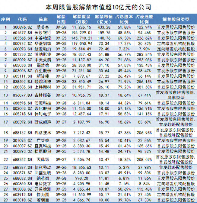 本周解禁市值超过10亿元的公司有29家,爱美客(300896.SZ)、长沙银行(601577.SH)、中谷物流(603565.SH)三家公司解禁市值超100亿元。华菱钢铁(000932.SZ)、航发动力(600893.SH)、博纳影业(001330.SZ)三家公司也各有超过60亿元的解禁规模。