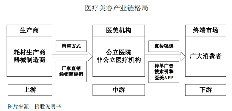 行业上游主要是生产耗材、医疗器械和原料生产商;中游是医美整形服务机构,涵盖了公立医院整形外科及皮肤科,民营医疗美容机构等;下游主要是消费者。