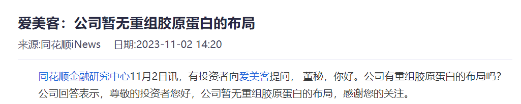 11月2日,有投资者向爱美客提问:“公司是否有重组胶原蛋白的布局?”爱美客回复暂时没有布局。