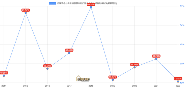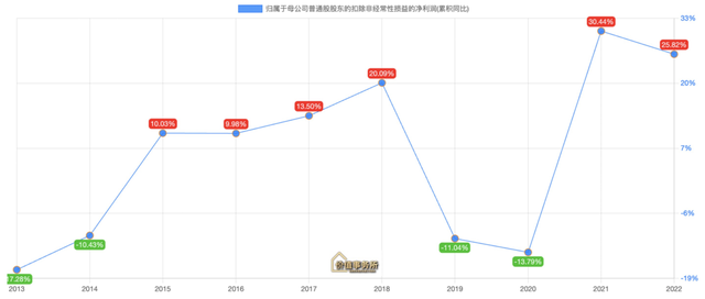这里我们可以再举几家中型企业的例子,下三图分别为药石科技、通策医疗、洋河股份的扣非净利润增速情况,有好的年份(大年),有不好的年份(小年),有越来越好的年份(日子顺),也有越来越差的年份(日子不顺),总之,就没有一条直线波澜不惊的时候。