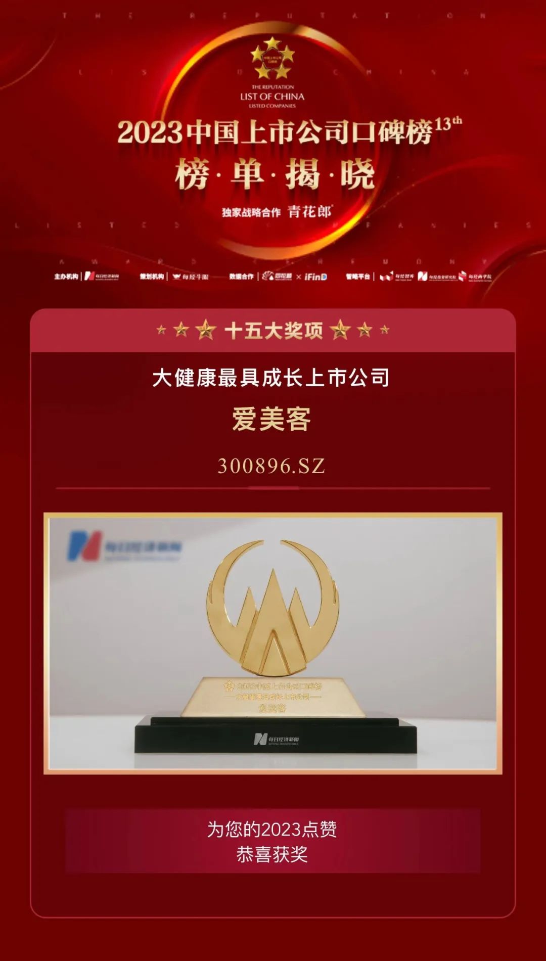 论坛现场,历时近3个月的激烈评审与层层筛选,备受资本市场瞩目的“2023第十三届中国上市公司口碑榜”隆重揭榜。爱美客凭借稳健的业绩表现和广阔的发展前景,荣获2023中国上市公司口碑榜之“大健康最具成长上市公司”称号。