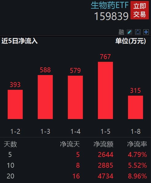 从资金净流入方面来看,生物药ETF近8天获得连续资金净流入,最高单日获得767.17万元净流入,合计“吸金”3354.32万元,日均净流入达419.29万元。