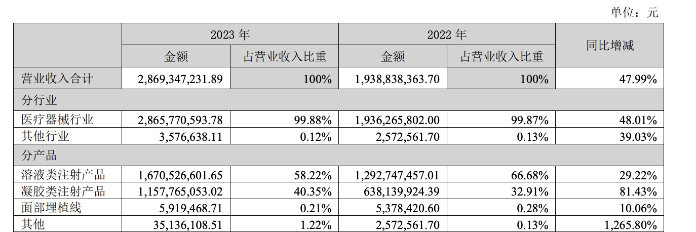 财报显示,2023年,爱美客溶液类注射产品实现营业收入16.71亿元,同比增长29.22%,占总营收的58.22%,产品毛利率为94.49%;凝胶类注射产品实现营业收入11.58亿元,同比增长81.43%,占总营收的40.35%,产品毛利率为97.49%。