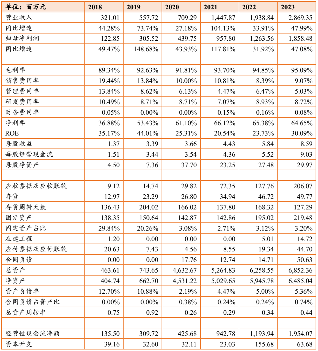 财务数据:2023年公司营业收入为28.69亿元,同比增长47.99%,归母净利润为18.58亿元,同比增长47.08%。毛利率为95.09%,净利率为64.65%,ROE为30.09%。