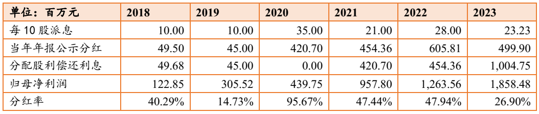 分红情况:公司的分红率一般,总体来讲不是很稳定,最近几年分红还不错,因为公司业绩挺好。