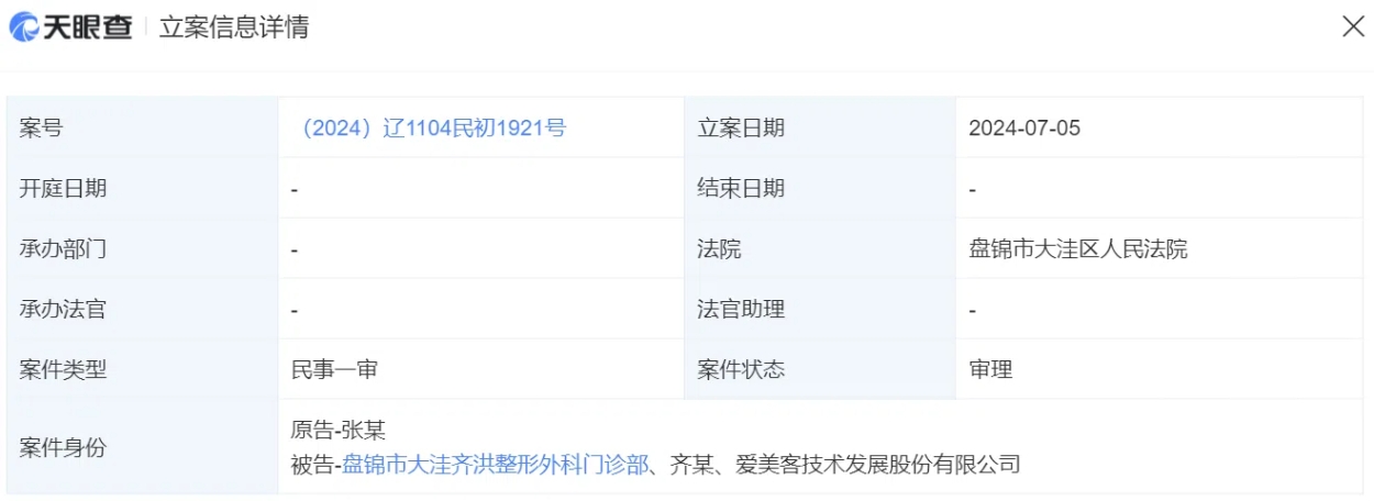 日前,爱美客新增一起医疗损害责任纠纷。原告为自然人张某,爱美客、盘锦市大洼齐洪整形外科门诊部、齐某同为被告,当前该案件已被盘锦市大洼区人民法院立案,处于民事一审阶段。