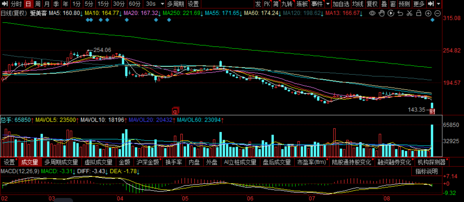 发布半年报后次日,爱美客股价大跌,截至8月22收盘,该公司股价报143.87元/股,较前一交易日下跌12.31%。
