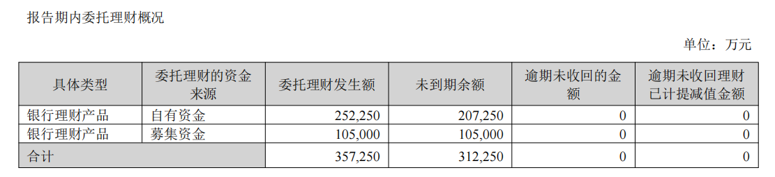 2024年上半年,该公司委托理财金额35.73亿元,均为银行银行理财产品。其中25.23亿来自自有资金,10.50亿元来自募集资金。