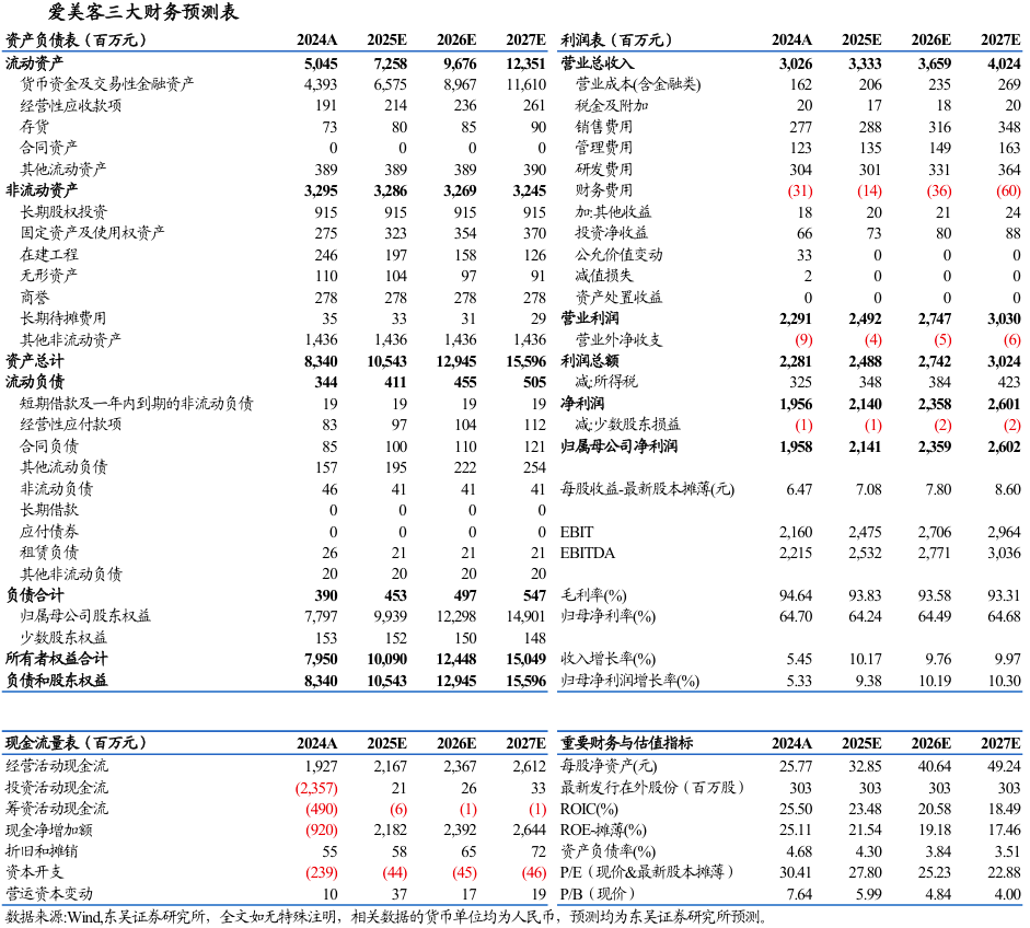 溶液类产品毛利率略降,公司整体盈利水平保持高位。2024年,公司销售毛利率/净利率分别为94.64%/64.66%,分别同比变化-0.45pp/+0.01pp。公司毛利率略降,净利率基本稳定,依然维持在高盈利水平。其中,溶液类注射产品毛利率 93.76%,同比-0.72pp;凝胶类注射产品毛利率 97.98%,同比+0.49pp,估计主要由于高端产品保持增长、占比提升。2024年,公司销售/管理/研发/财务费用率分别为10.93%/4.82%/17.88%/-0.66%,分别同比变化+4.03pp/+0.2pp/+4.91pp/+1.07pp。销售费用增加,主要系学术活动与营销推广增加;财务费用变化,主要系购买理财产品增加,其收益计入投资收益和公允价值变动损益所致。