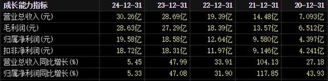 2024年年报显示,2024年爱美客实现营收30.26亿元,同比增长5.45%;实现归属净利润19.58亿元,同比增长5.33%。经对比可见,爱美客2024年的业绩增速创下2020年上市以来新低水平。