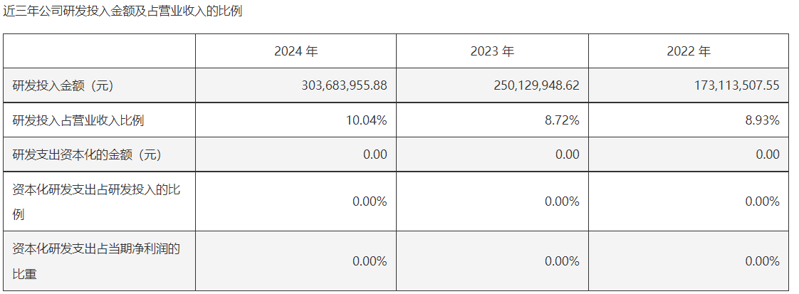 从2022年至2024年,爱美客的研发投入占营业收入的比例分别为8.93%、8.72%和10.04%。