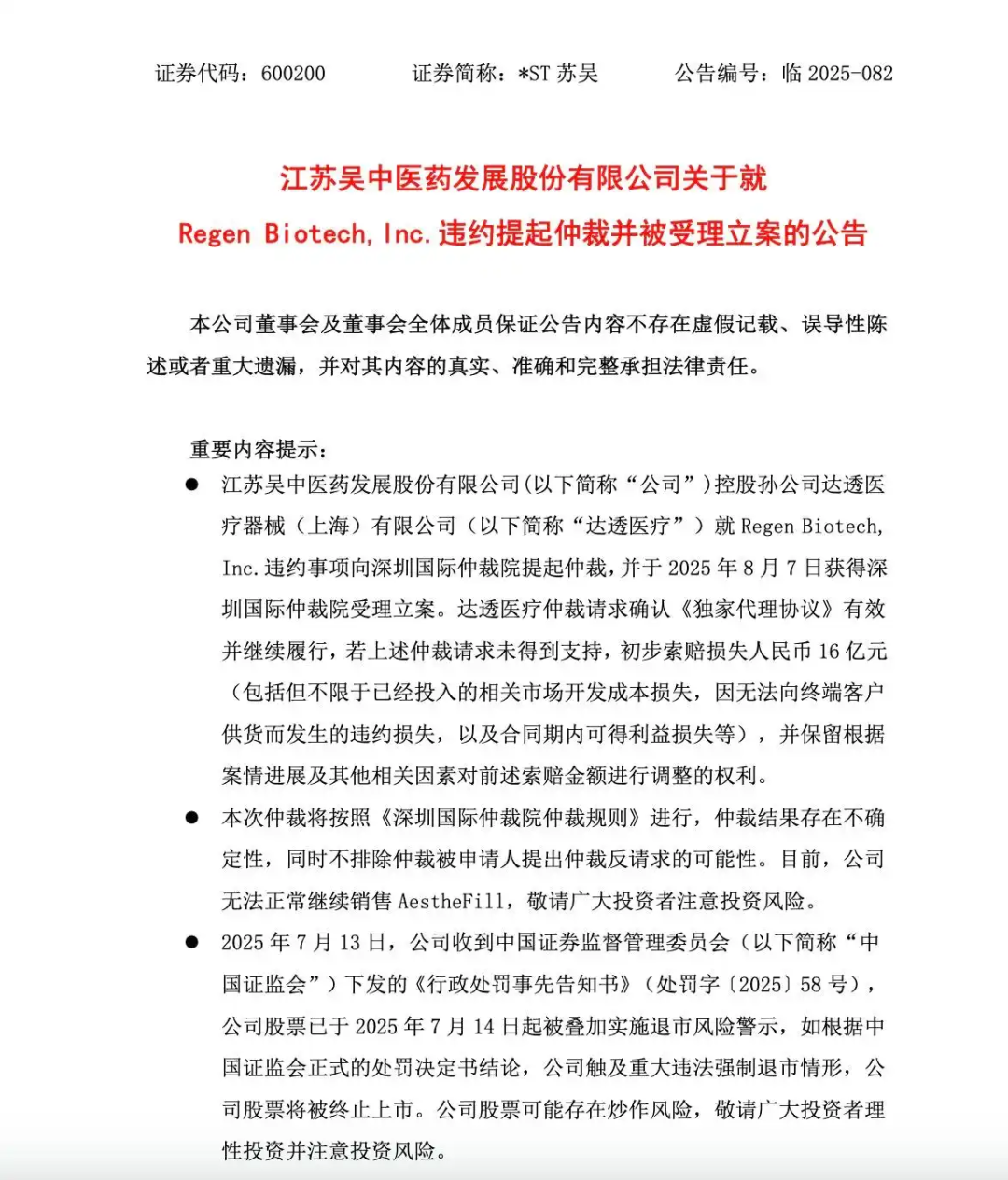 同日,江苏吴中发布公告称,控股孙公司达透医疗已就相关违约事项向深圳国际仲裁院提起仲裁,并于8月7日获得受理立案。达透医疗请求确认双方签署的《独家代理协议》有效并继续履行,若仲裁请求未获支持,将初步索赔损失人民币16亿元,涵盖市场开发成本、违约损失及合同期内可得利益损失等,并保留根据案情调整索赔金额的权利。