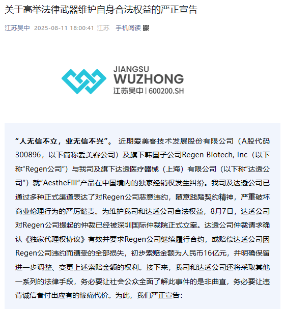 8月11日,江苏吴中再度在官方公众号上发表声明谴责爱美客,称“爱美客公司凭借资本优势,实施资本霸凌,恶意违约,意图将我司和达透公司数年心血培育、无数资源堆积而成的成果强取豪夺”。