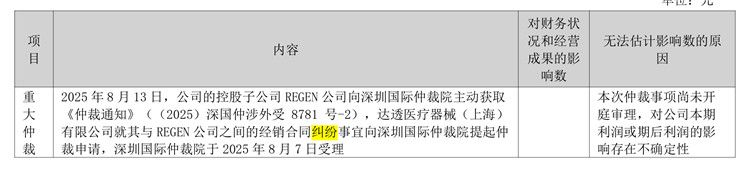 《笔尖网》关注到,2025 年8月13日,爱美客的控股子公司REGEN公司向深圳国际仲裁院主动获取《仲裁通知》((2025)深国仲涉外受 8781 号-2),达透医疗器械(上海)有限公司就其与REGEN公司之间的经销合同纠纷事宜向深圳国际仲裁院提起仲裁申请,深圳国际仲裁院于2025年8月7日受理。爱美客在公告中称,此次仲裁事项尚未开庭审理,对公司本期利润或期后利润的影响存在不确定性。