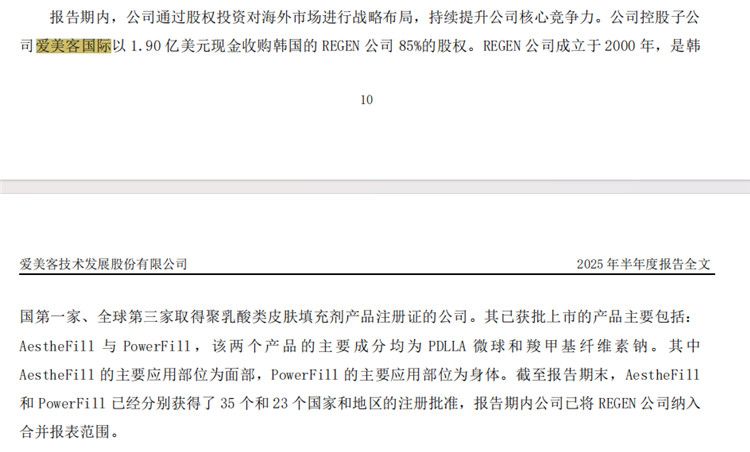 财报显示,爱美客控股子公司爱美客国际以1.9亿美元现金收购韩国REGEN公司85%股权,目前该公司已将REGEN公司纳入合并报表范围。