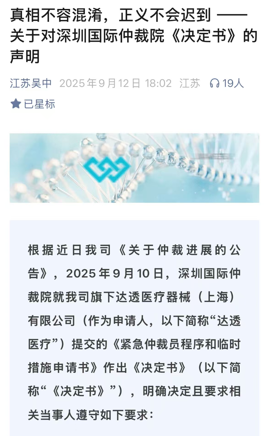 9月12日,该事件迎来关键进展。江苏吴中称深圳国际仲裁院作出《决定书》,明确要求REGEN在仲裁裁决作出前遵守三项要求:不得自行在中国大陆销售AestheFill产品、不得否认达透医疗的独家经销商身份、需按协议约定向达透医疗供货。