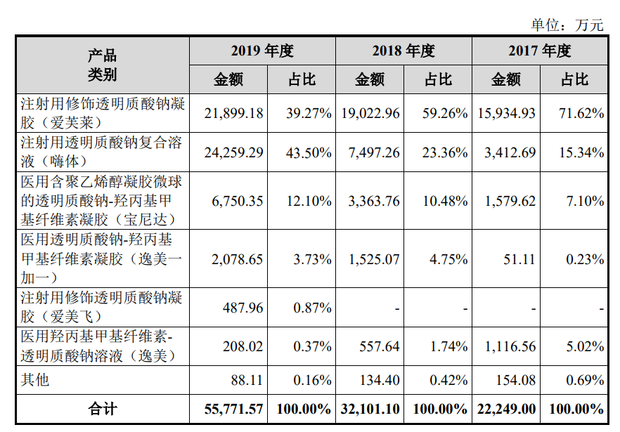 产品矩阵的持续扩容也推动爱美客迈向新台阶。2020年9月,爱美客以“玻尿酸第一股”的身份登陆深交所。招股书数据显示,报告期内逸美、宝尼达、爱芙莱、嗨体、逸美一加一、爱美飞等医美产品成为公司营收绝对主力。