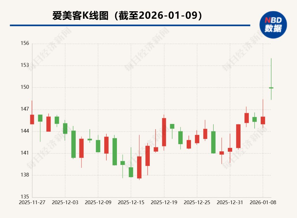 1月9日开盘,爱美客(SZ300896,股价149.91元,总市值453.62亿元)股价一度大幅上扬,截至当天收盘上涨2.69%。