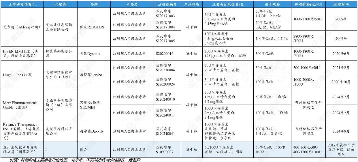 截至2024年,国内市场已有6款注射用A型肉毒毒素获批上市图片来源:摩熵医药中国药品批文数据库