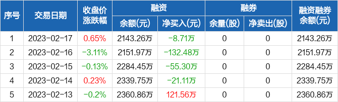 融资方面,当日融资买入55.18万元,融资偿还63.89万元,融资净偿还8.71万元,连续4日净偿还累计217.6万元。融券方面,融券卖出0股,融券偿还0股,融券余量0股,融券余额0元。融资融券余额合计2143.26万元。