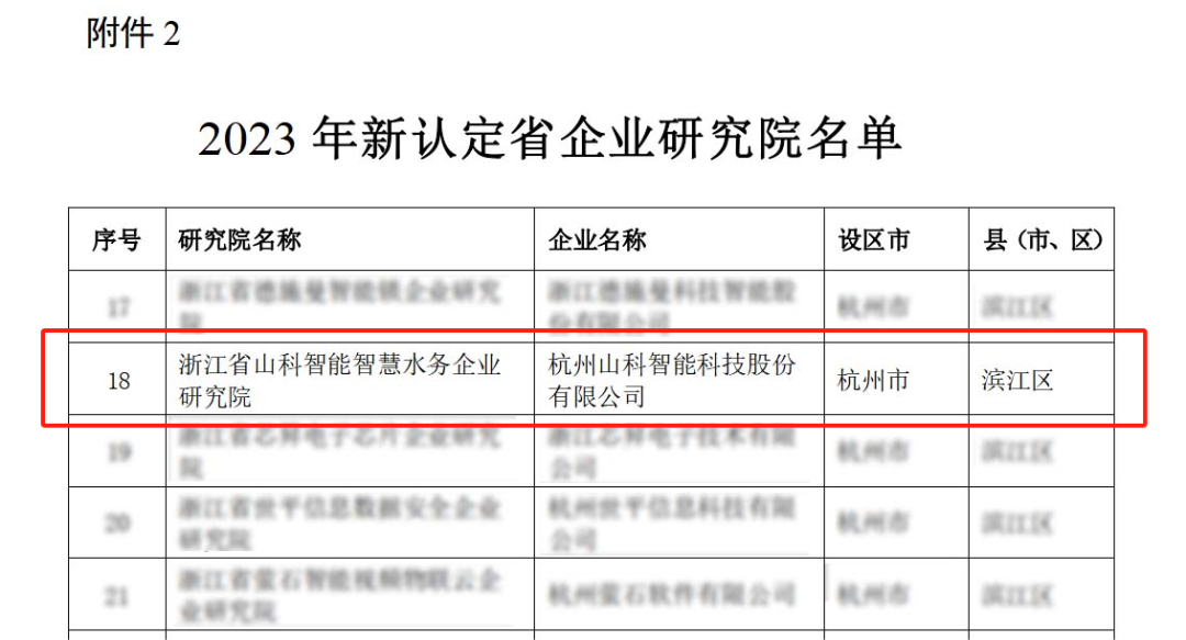 近日,浙江省科学技术厅发布了关于公布2023年新认定省级企业研发机构名单的通知。在市科技局推荐的基础上,经评审和复核,报厅务会审议同意,山科智能智慧水务企业研究院获评为“浙江省企业研究院”。这是继国家级“专精特新”小巨人企业、“国家高新技术企业”等之后对企业科研实力的又一次认可!