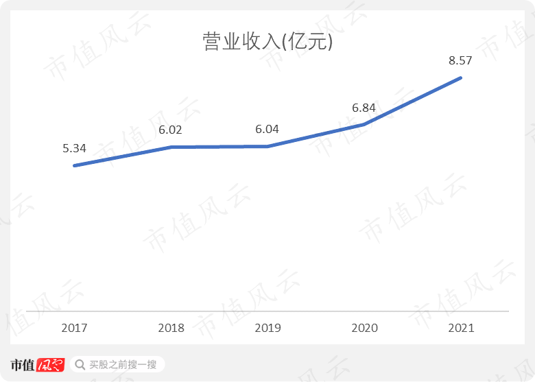 公司的营业收入从2017年的5.34亿元一路增长至2021年的8.57亿元,累积增长了60%,年均复合增长率为12.6%。