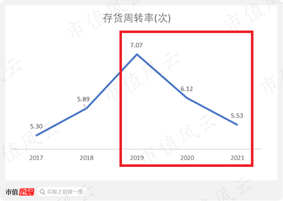与此同时,存货周转率也开始从2019年的7.07次下降至2021年的5.53次。存货风险明显在加剧。
