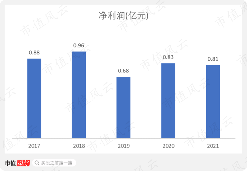 2019年净利润只有0.68亿元,较2018年下滑了近30%,2020和2021年净利润分别为0.83和0.81亿元,基本没有变化。公司现在的利润规模,甚至还不如2017年的水平。