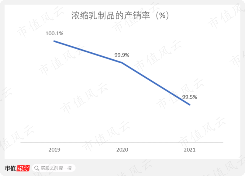 浓缩乳制品的产销率从2019年100.1%下降至2021年的99.5%。浓缩乳制品的库存量越来越多,而且产销率还有下滑的趋势。