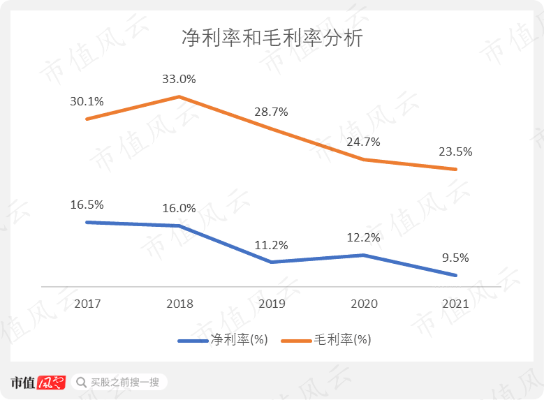 公司净利率从2017年的16.5%下降至2021年的9.5%。盈利能力明显在逐渐变差,而变差的直接原因是不断下滑的毛利率。公司毛利率从2018年的33%一路下滑至2021年的23.5%。