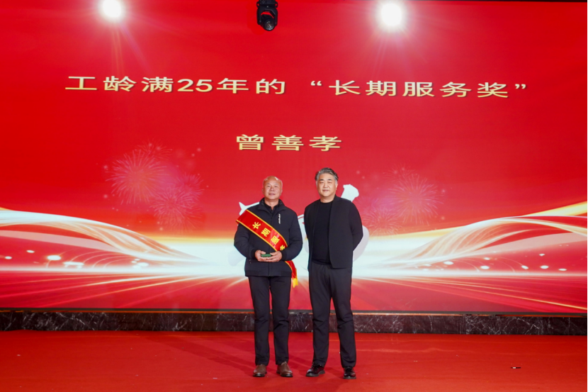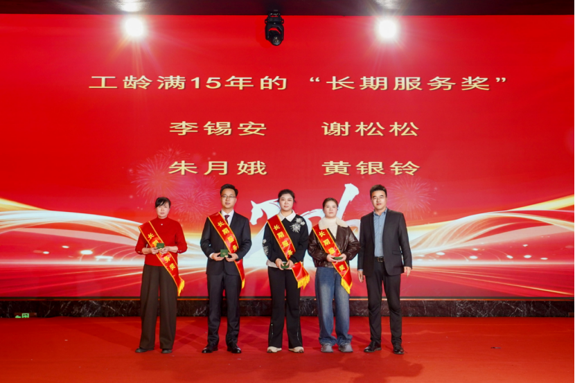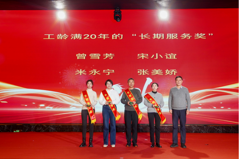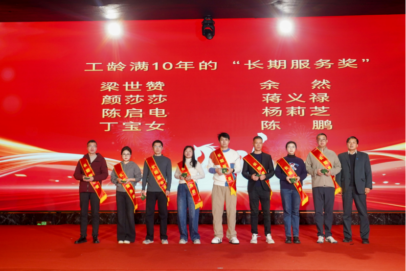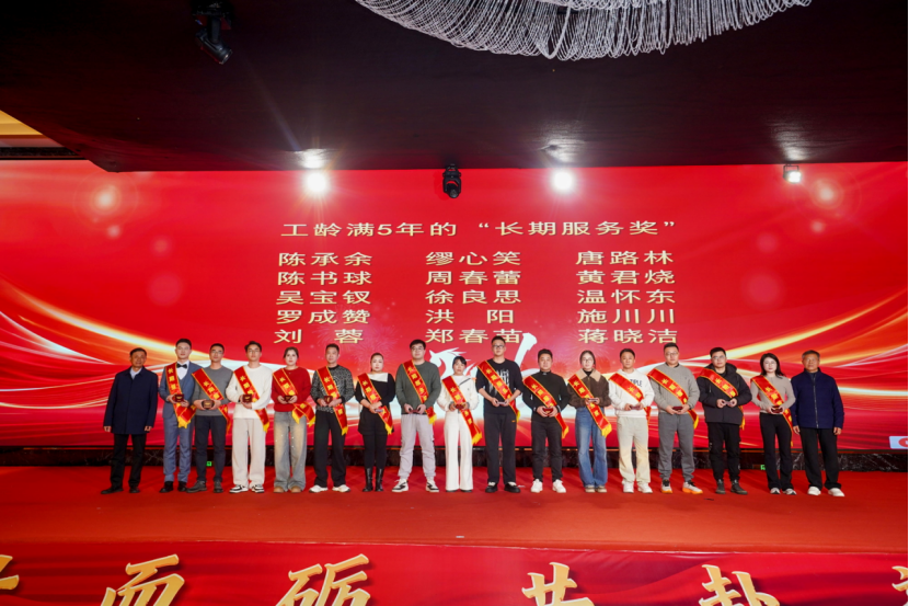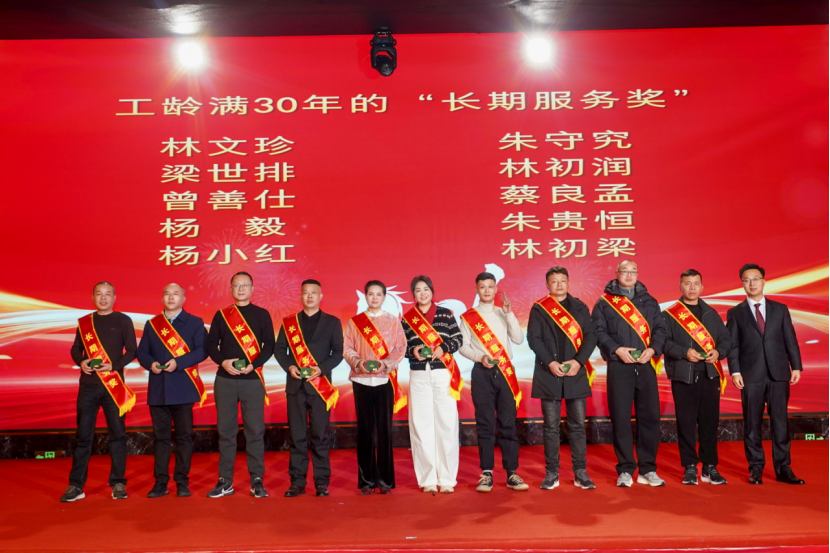 表彰环节始终是晚会的暖心高光时刻。为表彰先进、树立标杆,集团对“服务标兵”“生产标兵”“销售精英”“优秀员工”“先进管理者”等一批表现突出的个人与团队进行隆重颁奖。沉甸甸的荣誉,是对获奖者日复一日辛勤付出的最高肯定,更是集团对每一份坚守与耕耘的珍视。此外,长期服务奖颁奖环节温情满溢,从五年相伴到三十年坚守,每一份荣誉都镌刻着员工与企业同心同行的岁月印记,致敬他们用青春与汗水守护企业成长、践行初心使命。