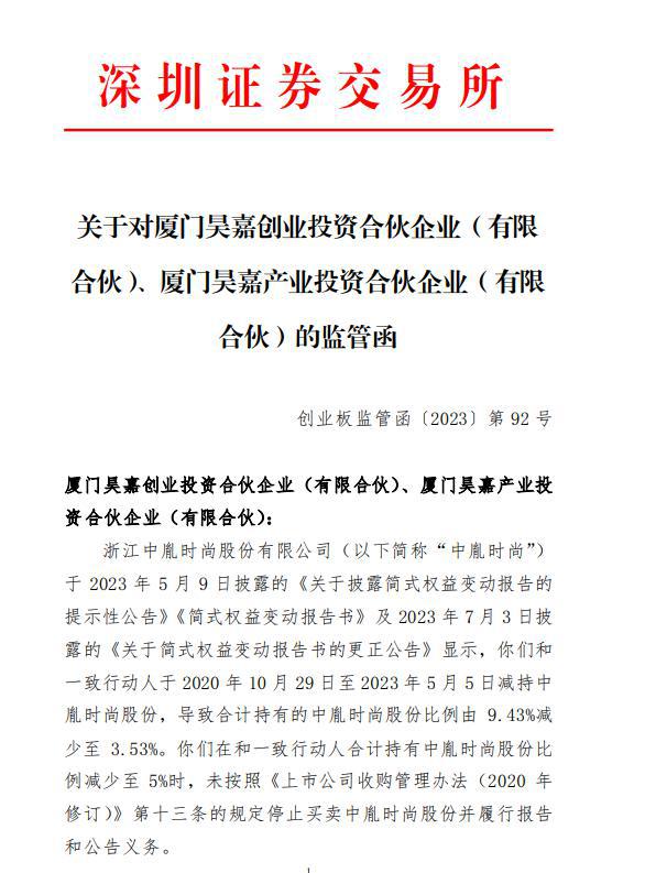 深交所17日向中胤时尚股东厦门昊嘉创业投资合伙企业(有限合伙)(下称“昊嘉创业”)和厦门昊嘉产业投资合伙企业业(有限合伙)(下称“昊嘉产业”)下发监管函。